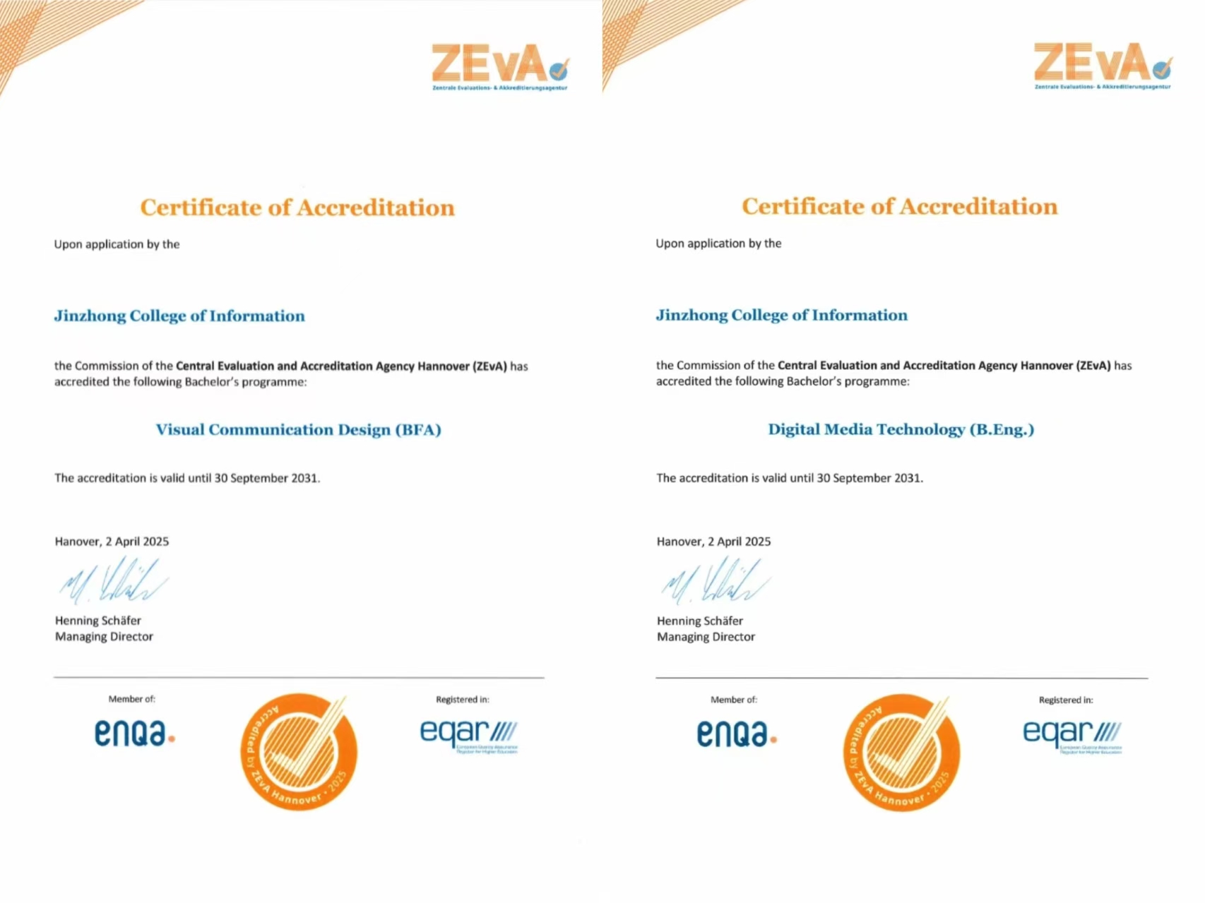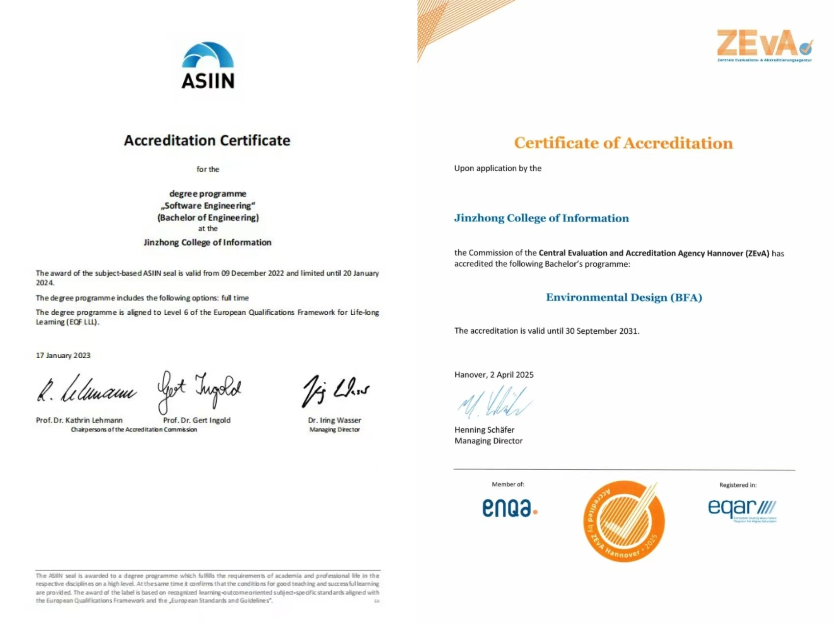 德国ASIIN认证和ZEvA认证均以严谨性和国际公认度著称。ASIIN认证被誉为工程教育领域的“金标准”,其评估涵盖教育目标、课程设置、师资队伍、教学资源及质量保障等各维度。软件工程、电气工程及其自动化、机械设计制造及其自动化、网络工程专业通过该认证,标志着四大专业在人才培养、科研创新、产业应用等方面已达到国际先进水平。而ZEvA认证则聚焦人文艺术类学科,数字媒体技术、视觉传达设计与环境设计专业凭借优质的课程模块、跨学科实践教学及校企协同育人模式,无条件顺利通过该认证,为学校专业建设国际化发展再次注入强劲动力。